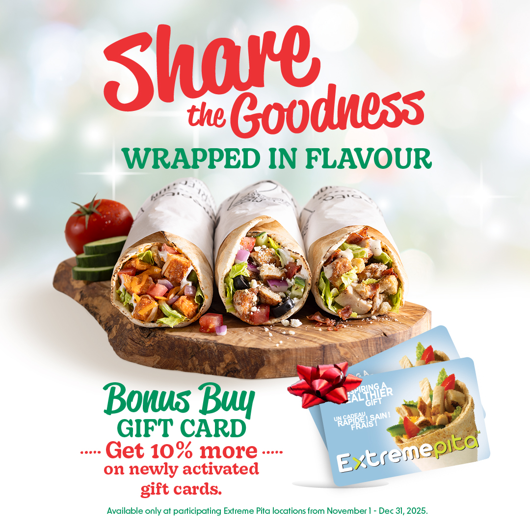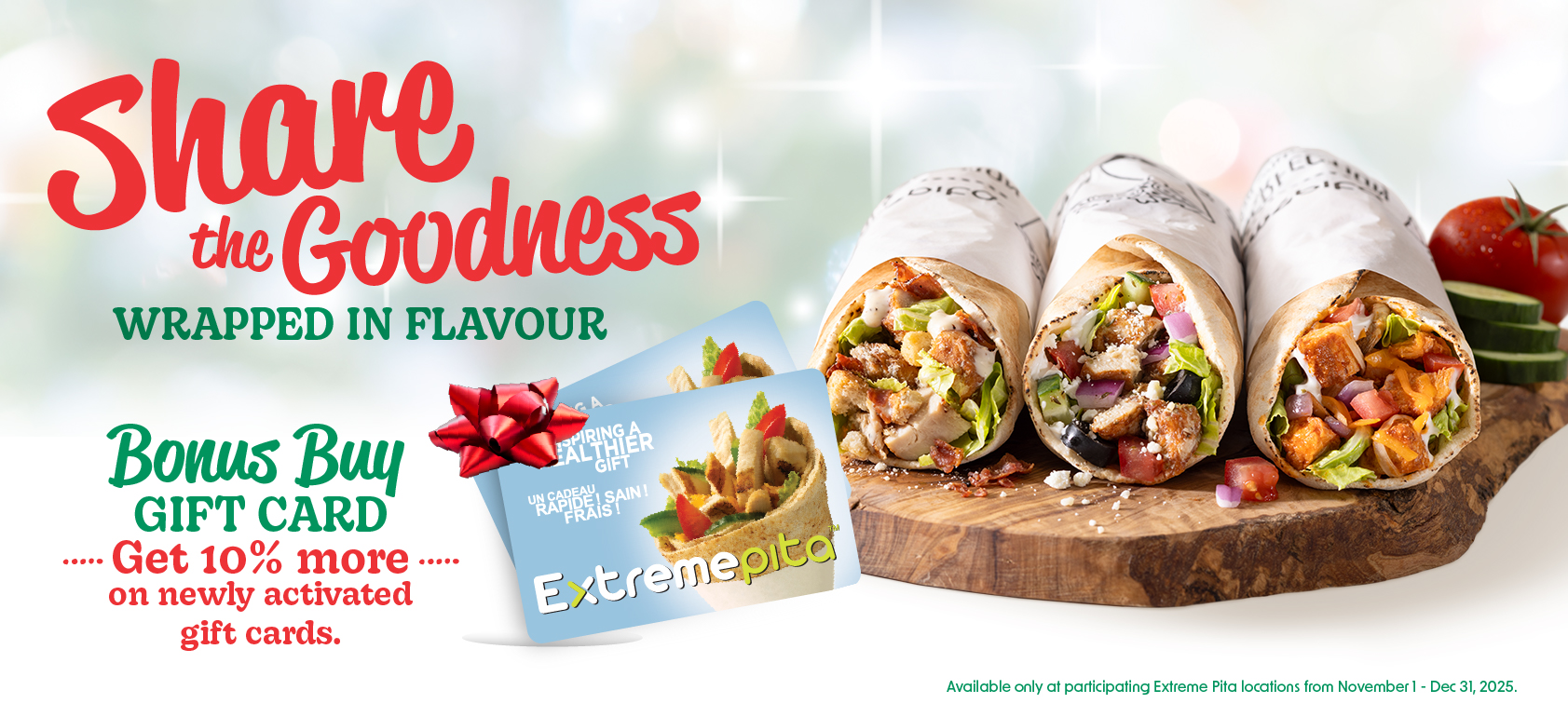 Gift cards are a great way to spread the love. Pick up an Extreme Pita gift card for yourself or as a gift for a friend today.