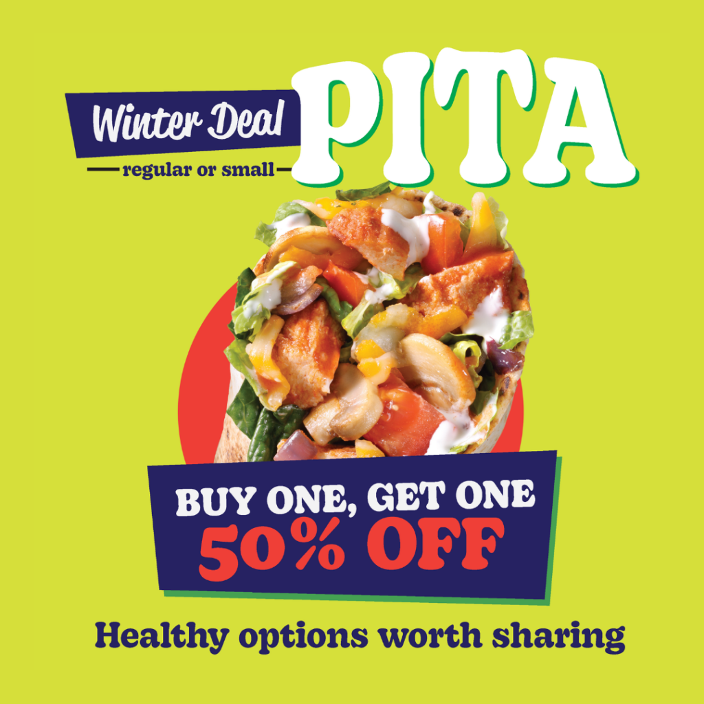 From January 1 to January 31, swing by any participating location and treat yourself to a regular or small rolled pita. Here’s the best part: when you buy one, you’ll get the second pita at 50% OFF! Just make sure your second pita is of equal or lesser value.